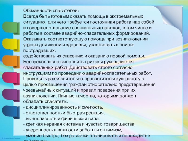 Проводить разъяснительно-просветительскую работу с целью просвещения граждан относительно предотвращения чрезвычайных ситуаций и правил поведения при их возникновении. Личные качества, которыми должен обладать спасатель:
