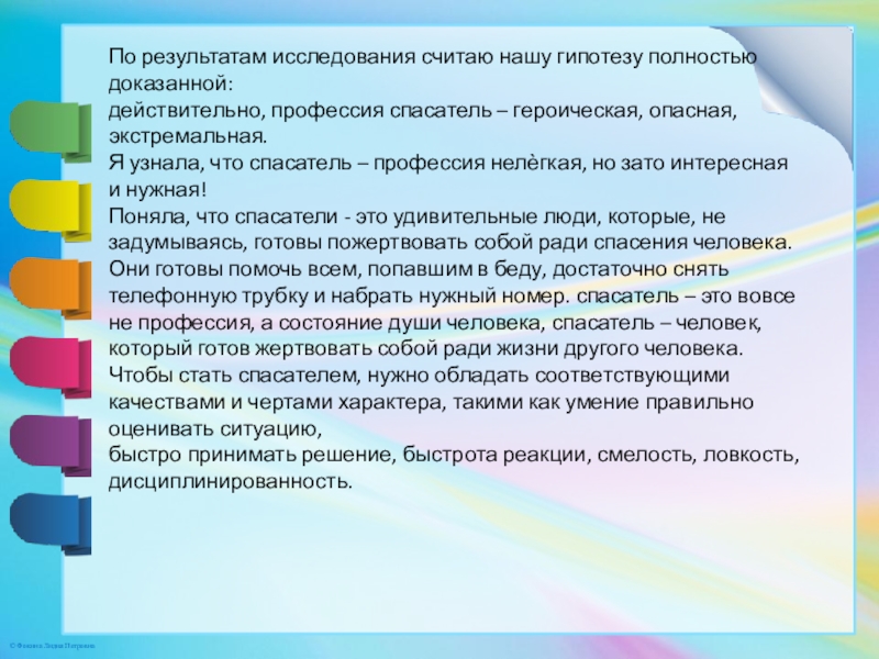 Слайд 9Данное исследование выявляет сущность профессии спасатель, раскрывает еѐ специфику. Способствует развитию