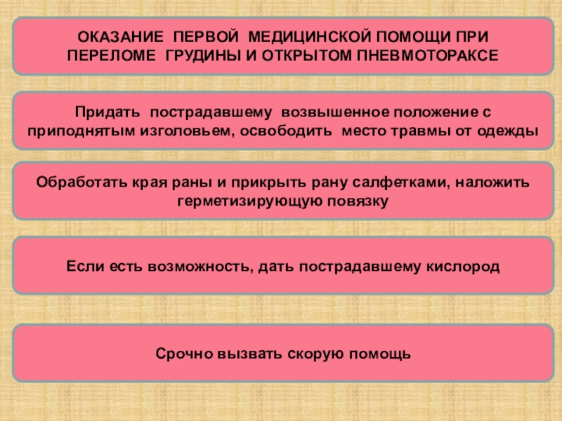Обработать края раны и прикрыть рану салфетками, наложить герметизирующую повязку