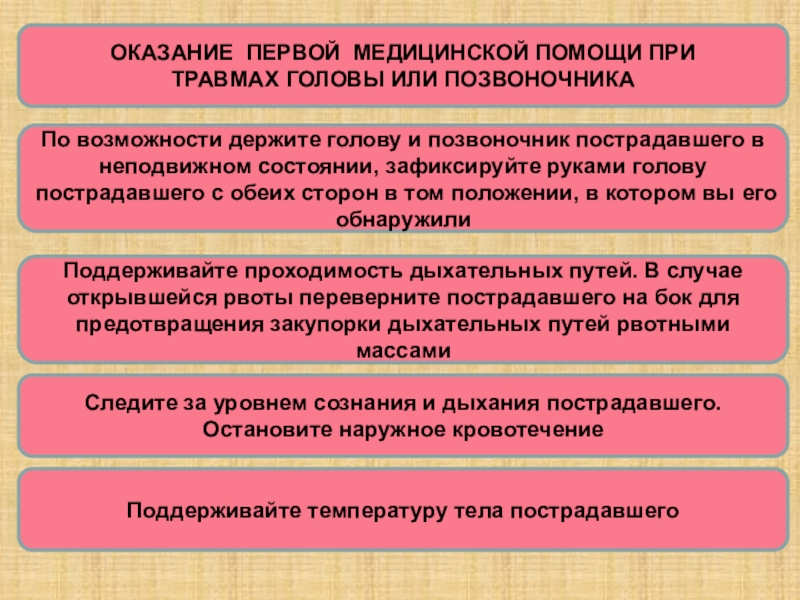 Следите за уровнем сознания и дыхания пострадавшего. Остановите наружное кровотечение