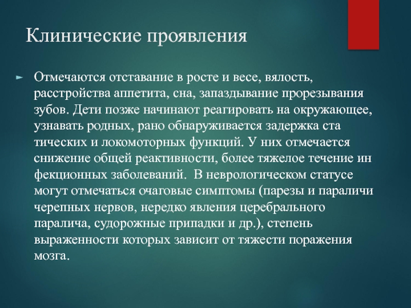 сна, запаздывание прорезывания зубов. Дети позже начинают реагировать на окружающее, узнавать родных, рано обнаруживается задержка статических и локомоторных функций. У них отмечается снижение общей реактивности, более тяжелое течение инфекционных заболеваний. В неврологическом статусе могут отмечаться очаговые симптомы (парезы и параличи черепных нервов, нередко явления церебрального паралича, судорожные припадки и др.), степень выраженности которых зависит от тяжести поражения мозга.