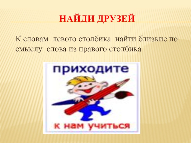 Найди друзей  К словам левого столбика найти близкие по смыслу слова из правого столбика