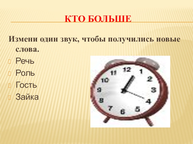Кто большеИзмени один звук, чтобы получились новые слова.РечьРольГостьЗайка