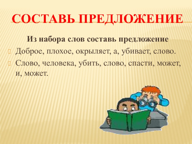 Составь предложениеИз набора слов составь предложениеДоброе, плохое, окрыляет, а, убивает, слово. Слово, человека, убить, слово, спасти, может,