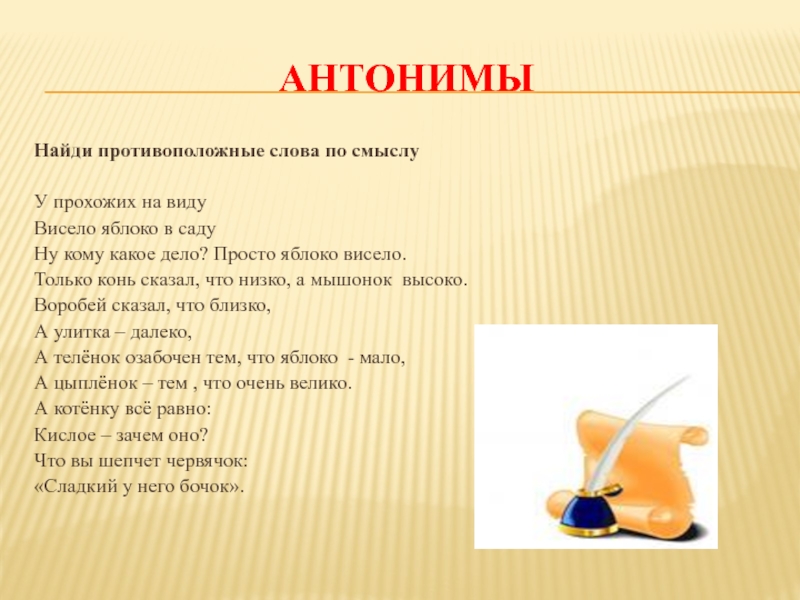 АнтонимыНайди противоположные слова по смыслуУ прохожих на виду Висело яблоко в садуНу кому какое дело? Просто яблоко
