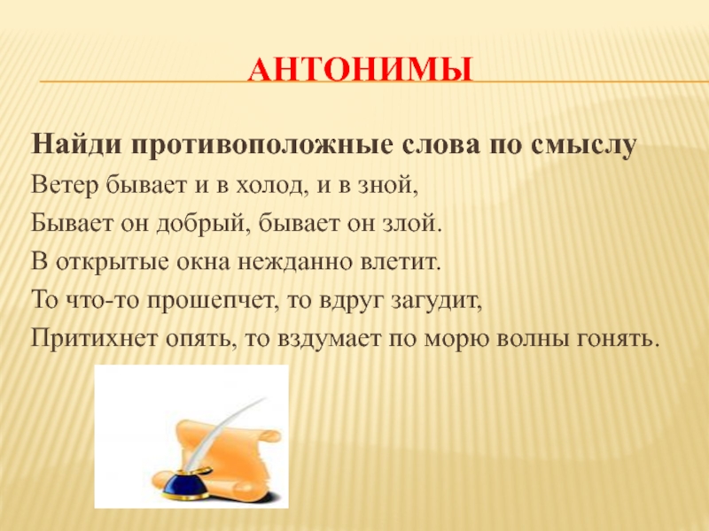 АнтонимыНайди противоположные слова по смыслуВетер бывает и в холод, и в зной,Бывает он добрый, бывает он злой.В
