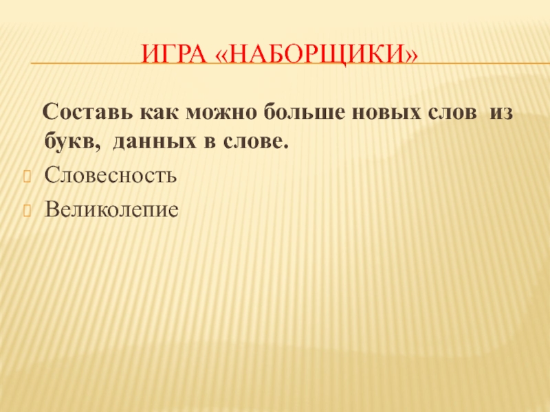 Игра «Наборщики»  Составь как можно больше новых слов из букв, данных в слове.СловесностьВеликолепие