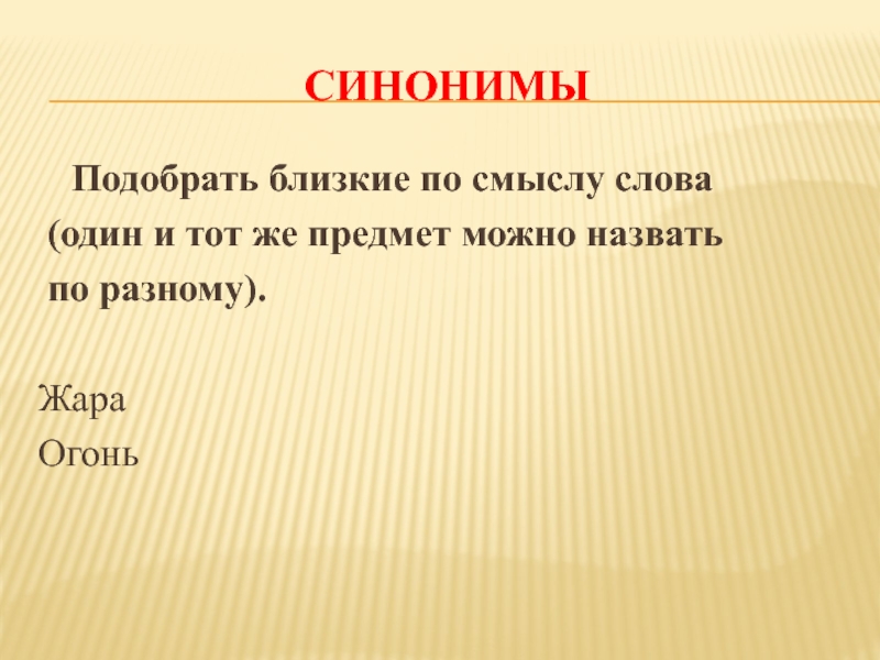 Синонимы  Подобрать близкие по смыслу слова (один и тот же предмет можно назвать по разному).ЖараОгонь