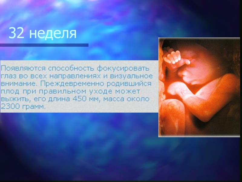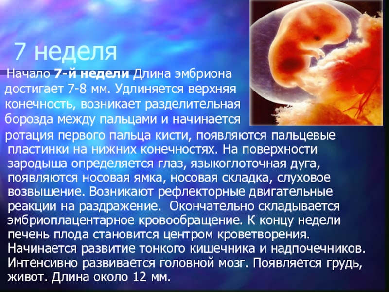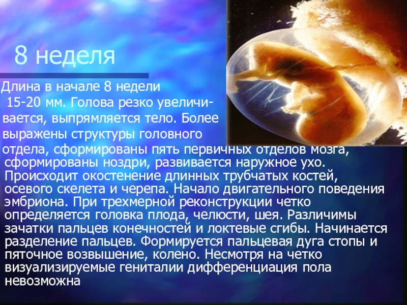 рост и дальнейшая дифференцировка систем органов. Вырисовываются черты лица, обособляется шея, формируются наружное ухо и наружные отделы носа, сформированы веки и все отделы конечностей, пальцы, исчезает хвост. Интенсивно развиваются большие полушария, в них различимы кора и базальные ганглии. Наружные половые органы дифференцированы по полу. Эмбрион через пупочный канатик связан с развивающейся плацентой, а ворсинки наружной оболочки связываются с организмом матери.