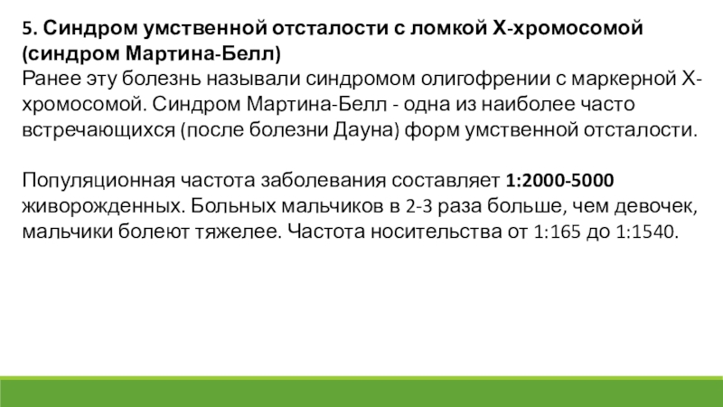 называли синдромом олигофрении с маркерной Х-хромосомой. Синдром Мартина-Белл - одна из наиболее часто встречающихся (после болезни Дауна) форм умственной отсталости.