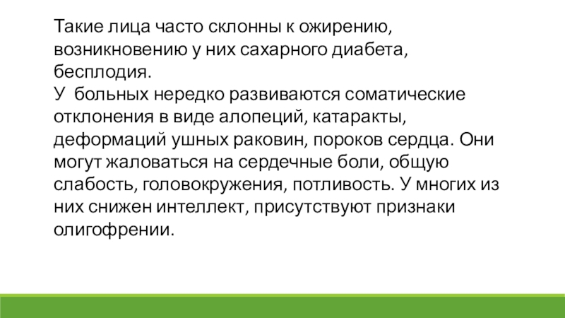 Слайд 34Такие лица часто склонны к ожирению, возникновению у них сахарного диабета,