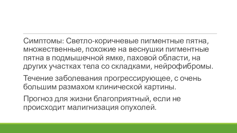 Слайд 4Симптомы: Светло-коричневые пигментные пятна, множественные, похожие на веснушки пигментные пятна в