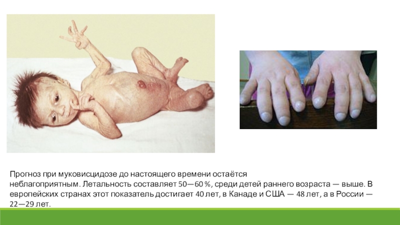Слайд 14Прогноз при муковисцидозе до настоящего времени остаётся неблагоприятным. Летальность составляет 50—60 %, среди детей