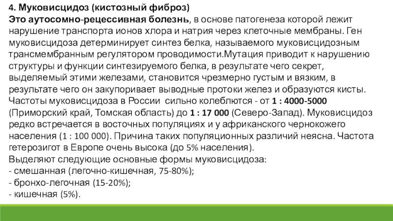 лежит нарушение транспорта ионов хлора и натрия через клеточные мембраны. Ген муковисцидоза детерминирует синтез белка, называемого муковисцидозным трансмембранным регулятором проводимости.Мутация приводит к нарушению структуры и функции синтезируемого белка, в результате чего секрет, выделяемый этими железами, становится чрезмерно густым и вязким, в результате чего он закупоривает выводные протоки желез и образуются кисты.