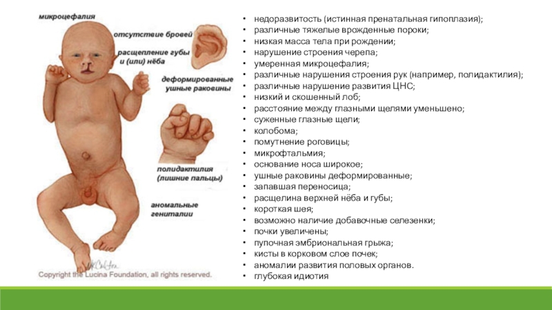 могут отсутствовать или быть недостаточно развиты некоторые структуры головного мозга (мозжечок, мозолистое тело);