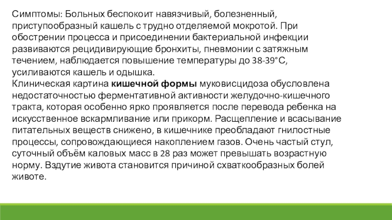 Клиническая картина кишечной формы муковисцидоза обусловлена недостаточностью ферментативной активности желудочно-кишечного тракта, которая особенно ярко проявляется после перевода ребенка на искусственное вскармливание или прикорм. Расщепление и всасывание питательных веществ снижено, в кишечнике преобладают гнилостные процессы, сопровождающиеся накоплением газов. Очень частый стул, суточный объём каловых масс в 28 раз может превышать возрастную норму. Вздутие живота становится причиной схваткообразных болей животе.
