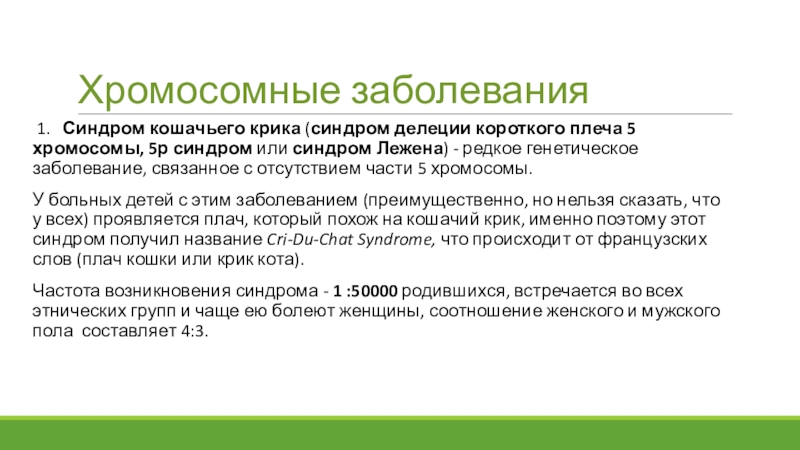 1. Синдром кошачьего крика (синдром делеции короткого плеча 5 хромосомы, 5р