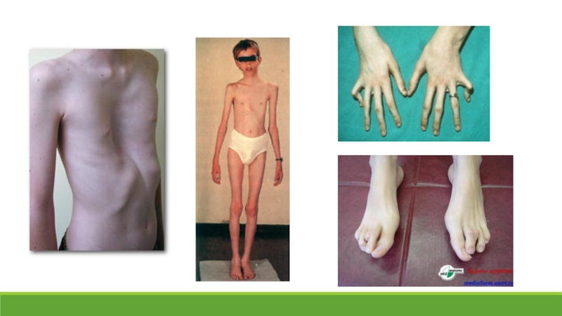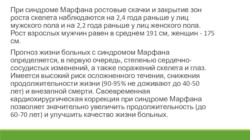 Слайд 7При синдроме Марфана ростовые скачки и закрытие зон роста скелета наблюдаются