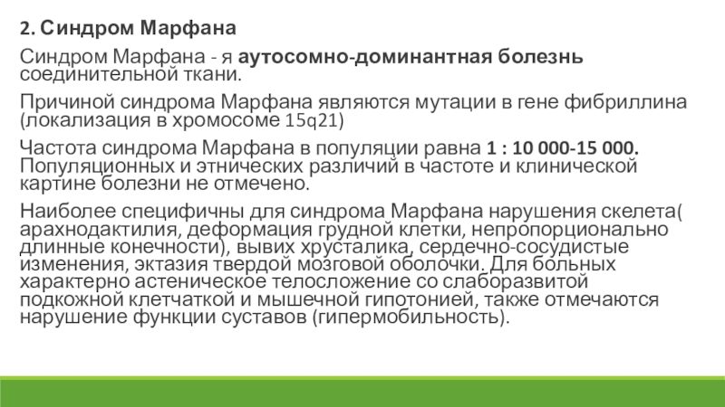 Синдром Марфана - я аутосомно-доминантная болезнь соединительной ткани.