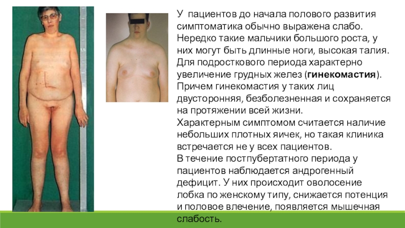 Для подросткового периода характерно увеличение грудных желез (гинекомастия). Причем гинекомастия у таких лиц двусторонняя, безболезненная и сохраняется на протяжении всей жизни.