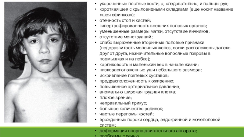 Этот синдром обусловлен полной или частичной X-моносомией,