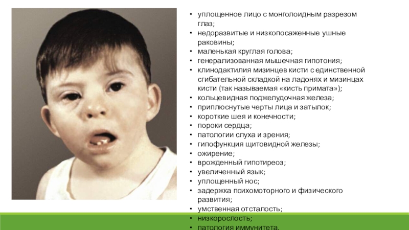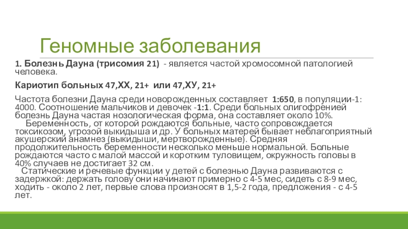 1. Болезнь Дауна (трисомия 21) - является частой хромосомной патологией