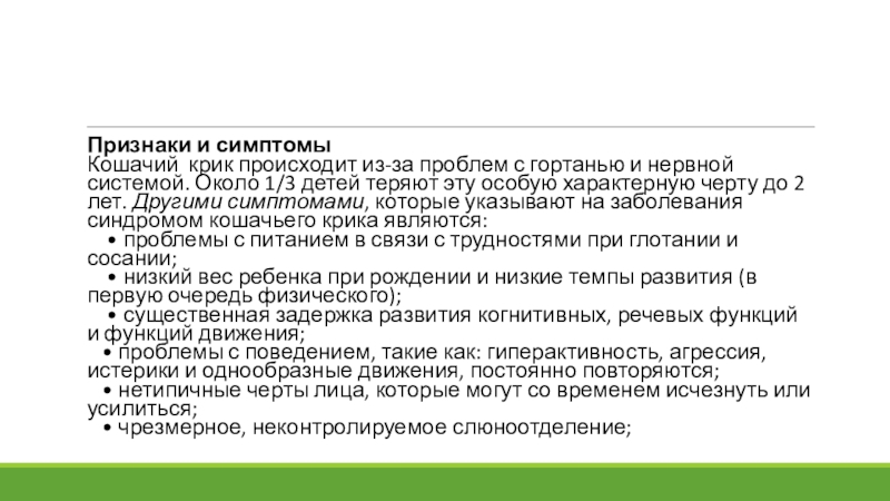 системой. Около 1/3 детей теряют эту особую характерную черту до 2 лет. Другими симптомами, которые указывают на заболевания синдромом кошачьего крика являются: