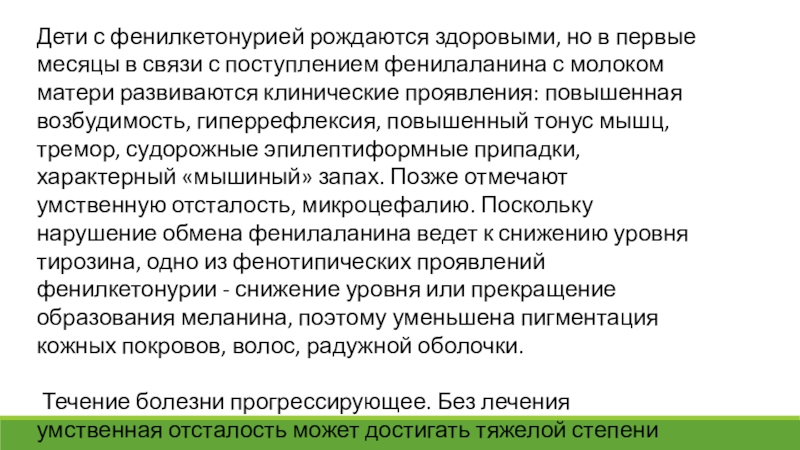 Слайд 10Дети с фенилкетонурией рождаются здоровыми, но в первые месяцы в связи