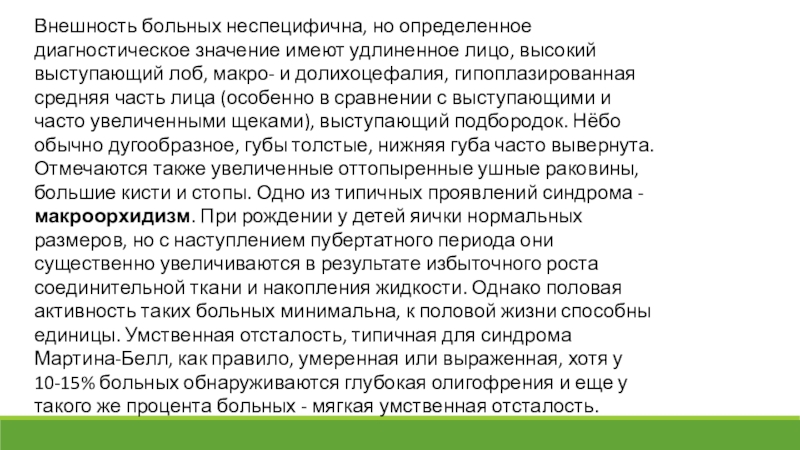 выступающий лоб, макро- и долихоцефалия, гипоплазированная средняя часть лица (особенно в сравнении с выступающими и часто увеличенными щеками), выступающий подбородок. Нёбо обычно дугообразное, губы толстые, нижняя губа часто вывернута. Отмечаются также увеличенные оттопыренные ушные раковины, большие кисти и стопы. Одно из типичных проявлений синдрома - макроорхидизм. При рождении у детей яички нормальных размеров, но с наступлением пубертатного периода они существенно увеличиваются в результате избыточного роста соединительной ткани и накопления жидкости. Однако половая активность таких больных минимальна, к половой жизни способны единицы. Умственная отсталость, типичная для синдрома Мартина-Белл, как правило, умеренная или выраженная, хотя у 10-15% больных обнаруживаются глубокая олигофрения и еще у такого же процента больных - мягкая умственная отсталость.