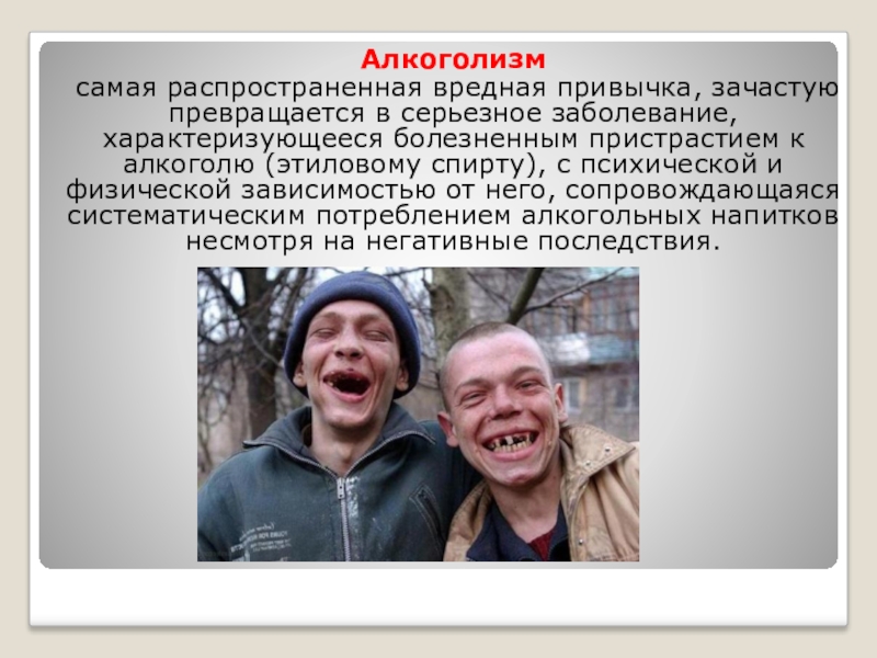характеризующееся болезненным пристрастием к алкоголю (этиловому спирту), с психической и физической зависимостью от него, сопровождающаяся систематическим потреблением алкогольных напитков несмотря на негативные последствия.