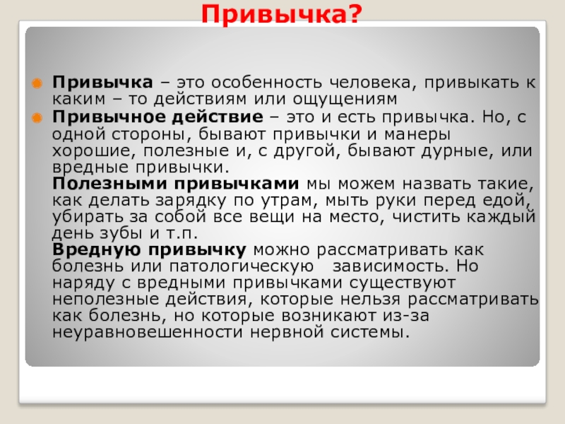Привычка – это особенность человека, привыкать к каким – то действиям