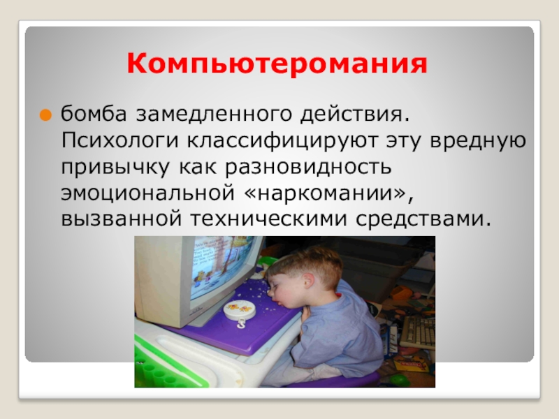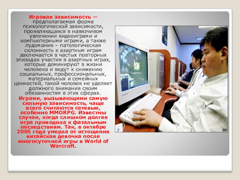 Слайд 13Игровая зависимость — предполагаемая форма психологической зависимости, проявляющаяся в навязчивом увлечении