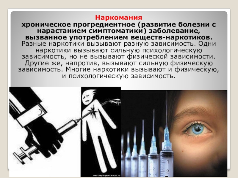 Разные наркотики вызывают разную зависимость. Одни наркотики вызывают сильную психологическую зависимость, но не вызывают физической зависимости. Другие же, напротив, вызывают сильную физическую зависимость. Многие наркотики вызывают и физическую, и психологическую зависимость.