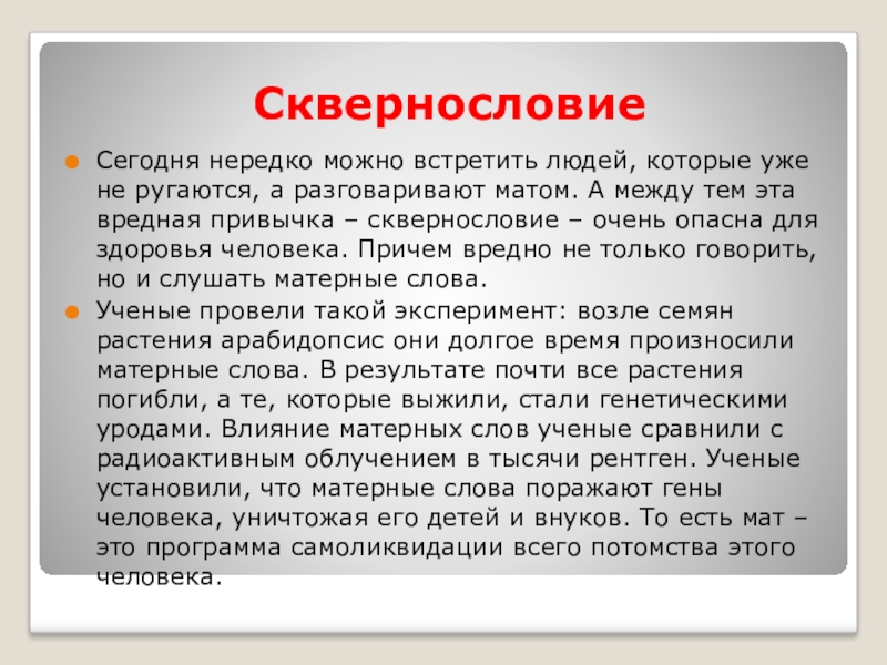 Ученые провели такой эксперимент: возле семян растения арабидопсис они долгое время произносили матерные слова. В результате почти все растения погибли, а те, которые выжили, стали генетическими уродами. Влияние матерных слов ученые сравнили с радиоактивным облучением в тысячи рентген. Ученые установили, что матерные слова поражают гены человека, уничтожая его детей и внуков. То есть мат – это программа самоликвидации всего потомства этого человека.