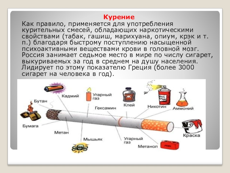 (табак, гашиш, марихуана, опиум, крэк и т. п.) благодаря быстрому поступлению насыщенной психоактивными веществами крови в головной мозг.