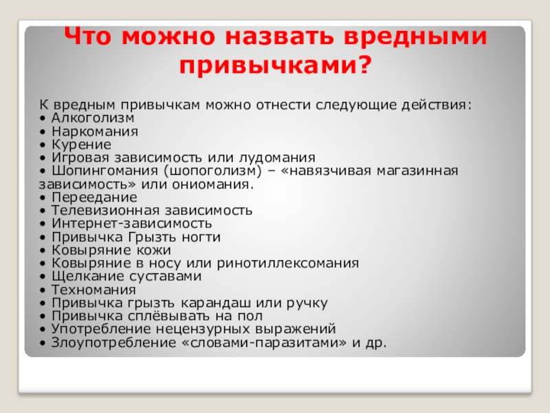 Полезными привычками мы можем назвать такие, как делать зарядку по утрам, мыть руки перед едой, убирать за собой все вещи на место, чистить каждый день зубы и т.п. Вредную привычку можно рассматривать как болезнь или патологическую зависимость. Но наряду с вредными привычками существуют неполезные действия, которые нельзя рассматривать как болезнь, но которые возникают из-за неуравновешенности нервной системы.