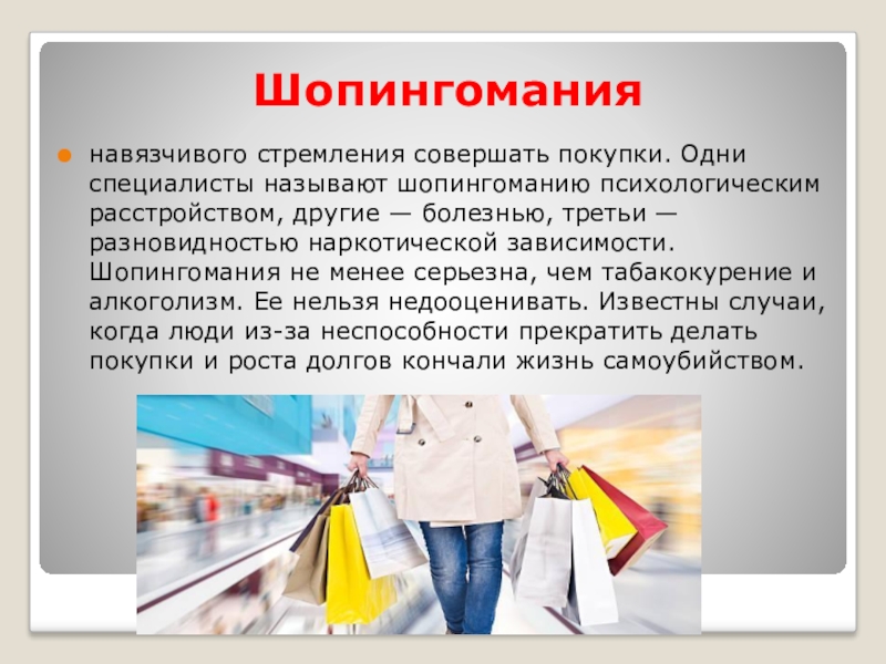 • Шопингомания (шопоголизм) – «навязчивая магазинная зависимость» или ониомания.