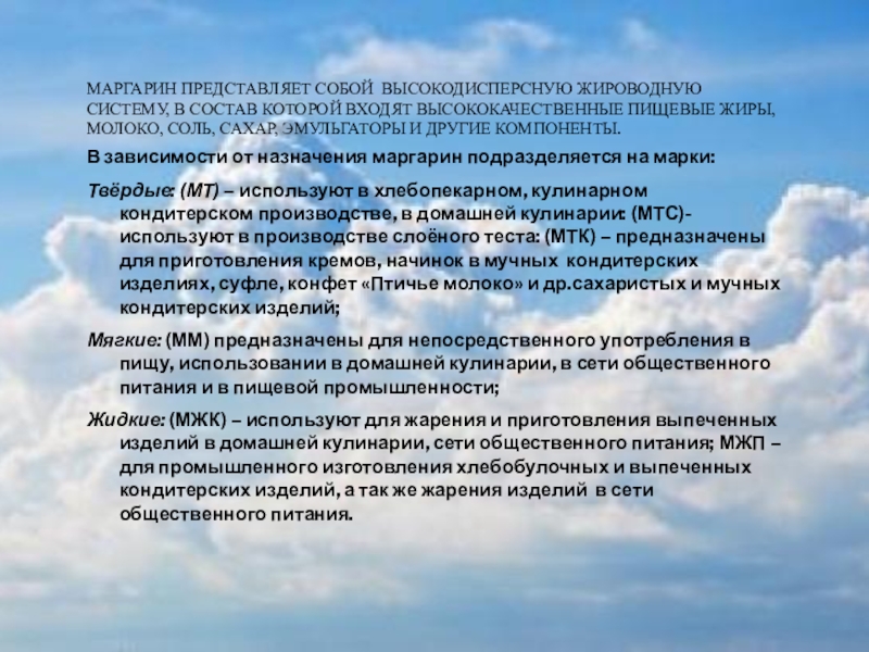 Твёрдые: (МТ) – используют в хлебопекарном, кулинарном кондитерском производстве, в домашней кулинарии: (МТС)- используют в производстве слоёного теста: (МТК) – предназначены для приготовления кремов, начинок в мучных кондитерских изделиях, суфле, конфет «Птичье молоко» и др.сахаристых и мучных кондитерских изделий;