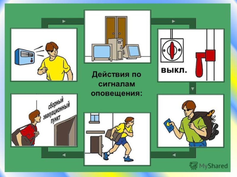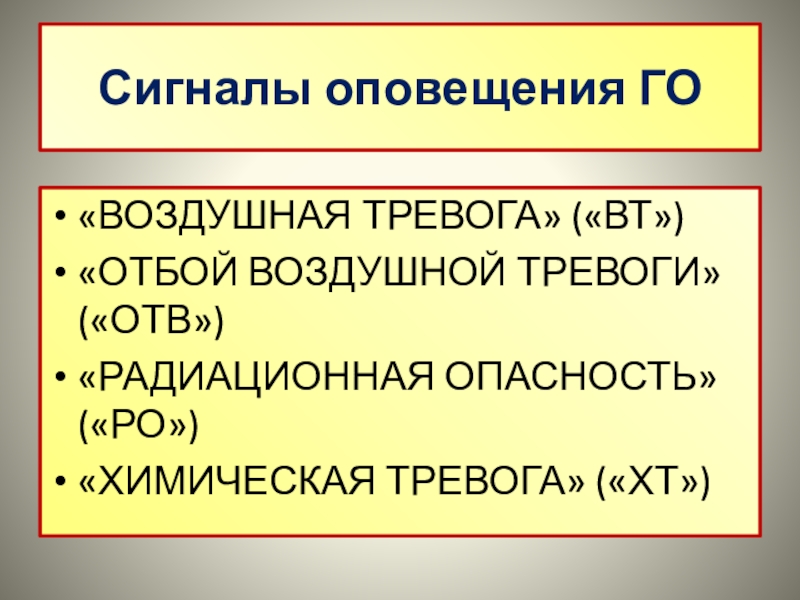 Сигналы оповещения ГО«ВОЗДУШНАЯ ТРЕВОГА» («ВТ»)«ОТБОЙ ВОЗДУШНОЙ ТРЕВОГИ» («ОТВ»)«РАДИАЦИОННАЯ ОПАСНОСТЬ» («РО»)«ХИМИЧЕСКАЯ ТРЕВОГА» («ХТ»)