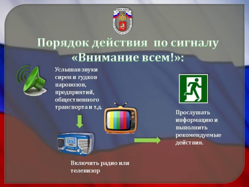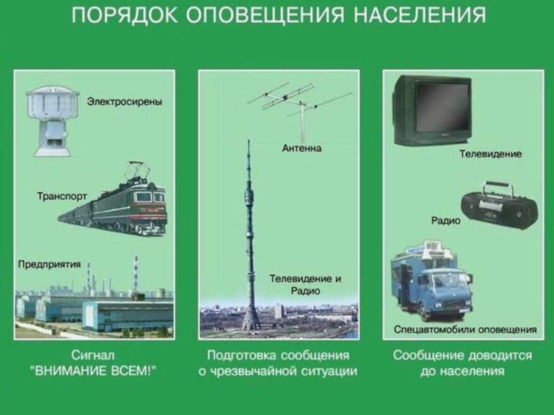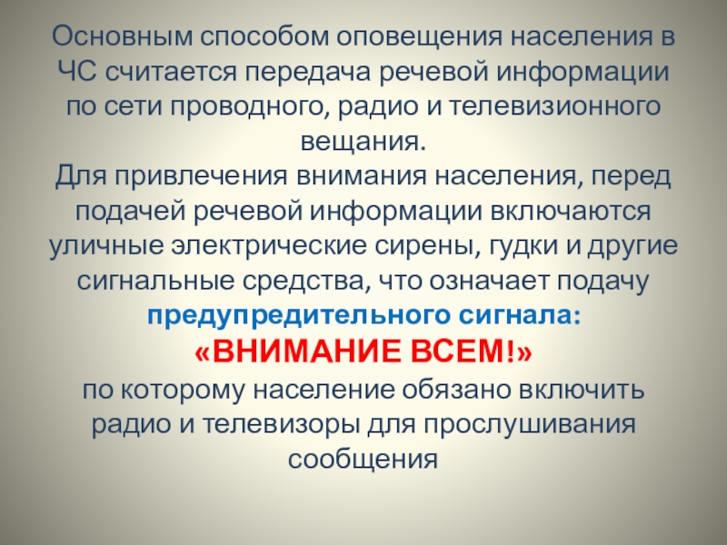сети проводного, радио и телевизионного вещания. Для привлечения внимания населения, перед подачей речевой информации включаются уличные электрические сирены, гудки и другие сигнальные средства, что означает подачу предупредительного сигнала: «ВНИМАНИЕ ВСЕМ!» по которому население обязано включить радио и телевизоры для прослушивания сообщения
