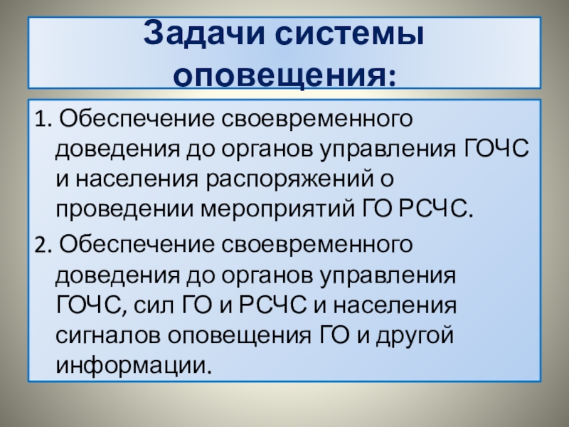 Задачи системы оповещения:1. Обеспечение своевременного доведения до органов управления ГОЧС и населения распоряжений о проведении мероприятий ГО