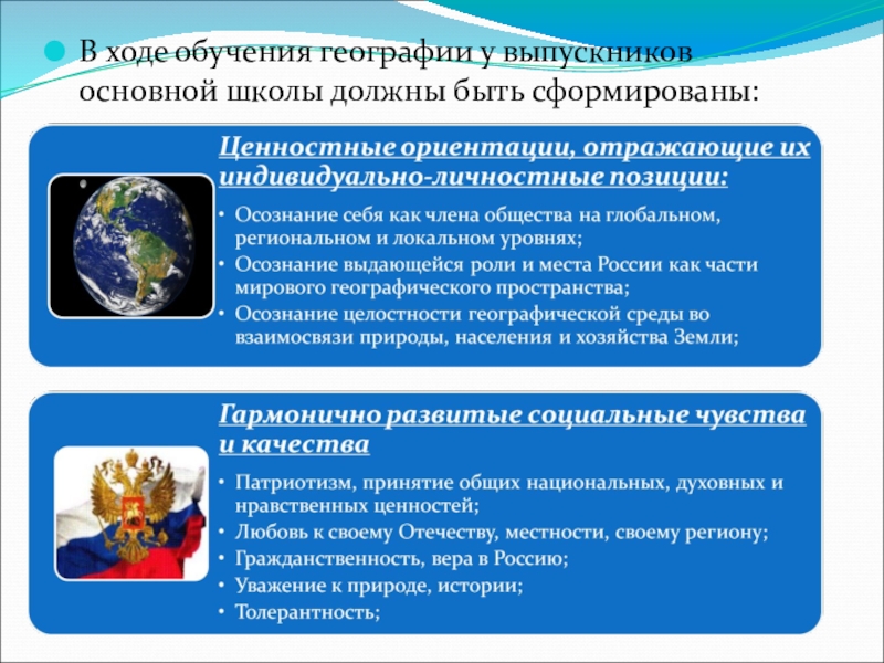Слайд 5В ходе обучения географии у выпускников основной школы должны быть сформированы: