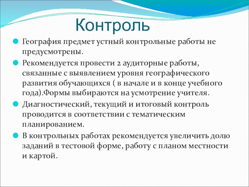 В контрольных работах рекомендуется увеличить долю заданий в тестовой форме, работу с планом местности и картой.