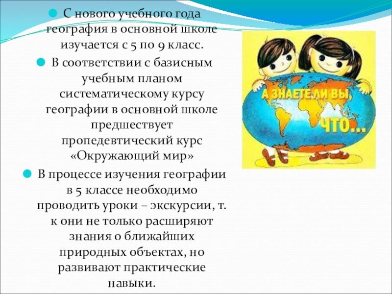 В соответствии с базисным учебным планом систематическому курсу географии в основной школе предшествует пропедевтический курс «Окружающий мир»