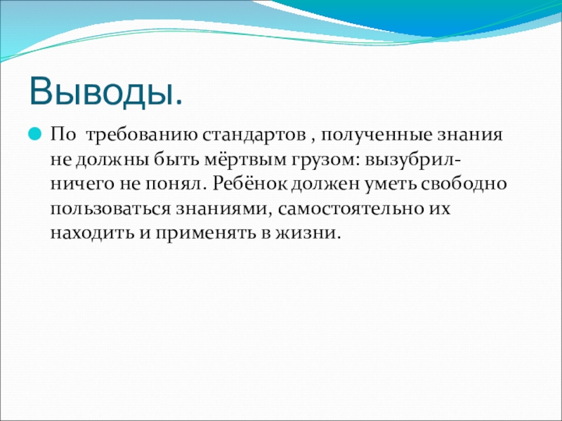 грузом: вызубрил- ничего не понял. Ребёнок должен уметь свободно пользоваться знаниями, самостоятельно их находить и применять в жизни.
