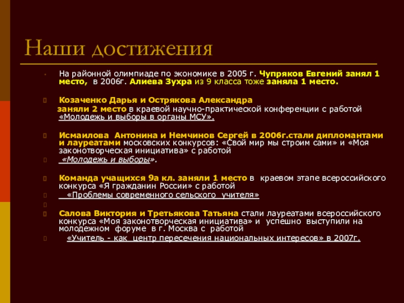 На районной олимпиаде по экономике в 2005 г. Чупряков Евгений