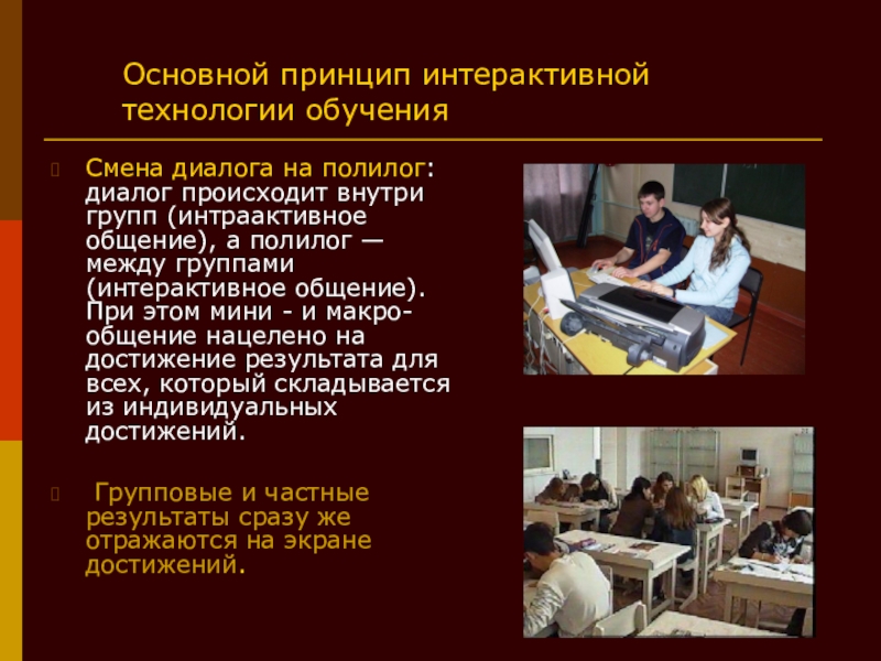 полилог — между группами (интерактивное общение). При этом мини - и макро- общение нацелено на достижение результата для всех, который складывается из индивидуальных достижений.
