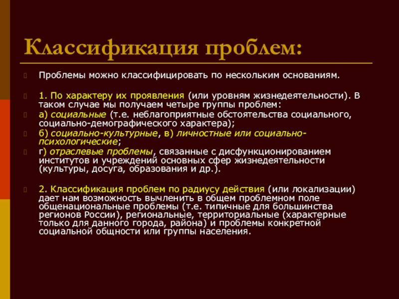 возможности должно включить весь перечень проблем, различных по характеру (социальные; социально-демографические; социально-культурные; личностные или социально-психологические; отраслевые); радиусу действия или локализации (общенациональные; региональные; территориальные, характерные только для данного города, района, проблемы конкретной социальной общности или группы населения); по содержанию или сферам социально-культурной проблематики (проблемы в сфере художественной, исторической, духовно-нравственной, экологической, политический культуры и т.д.).