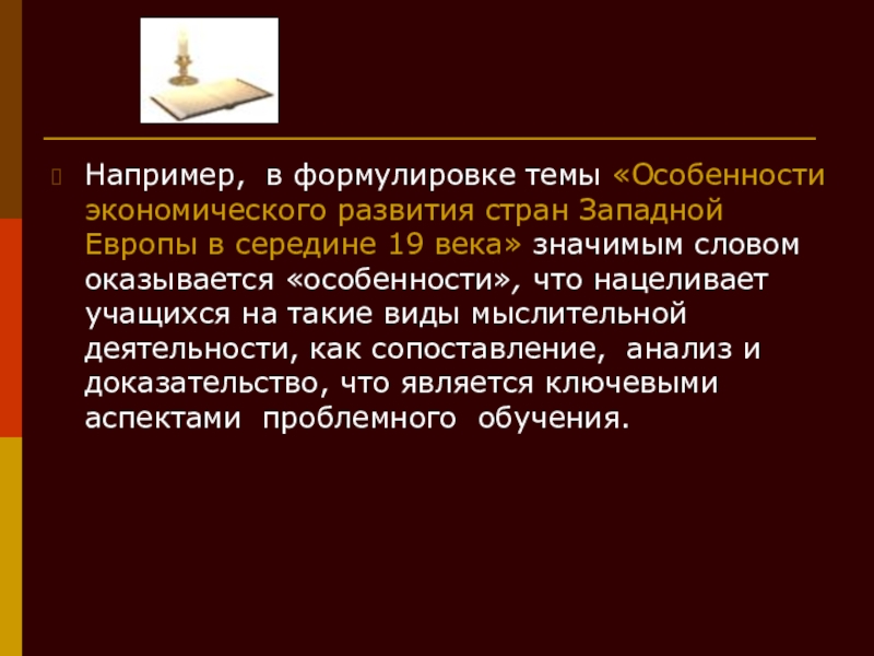 середине 19 века» значимым словом оказывается «особенности», что нацеливает учащихся на такие виды мыслительной деятельности, как сопоставление, анализ и доказательство, что является ключевыми аспектами проблемного обучения.