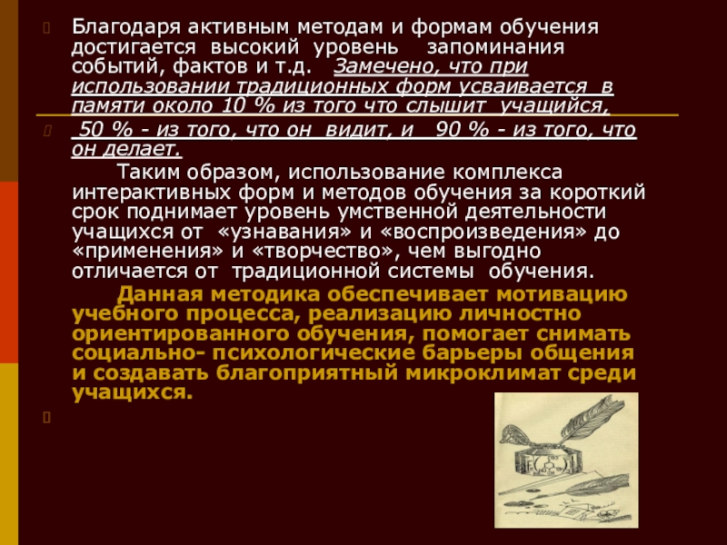 Слайд 37Благодаря активным методам и формам обучения достигается высокий уровень запоминания